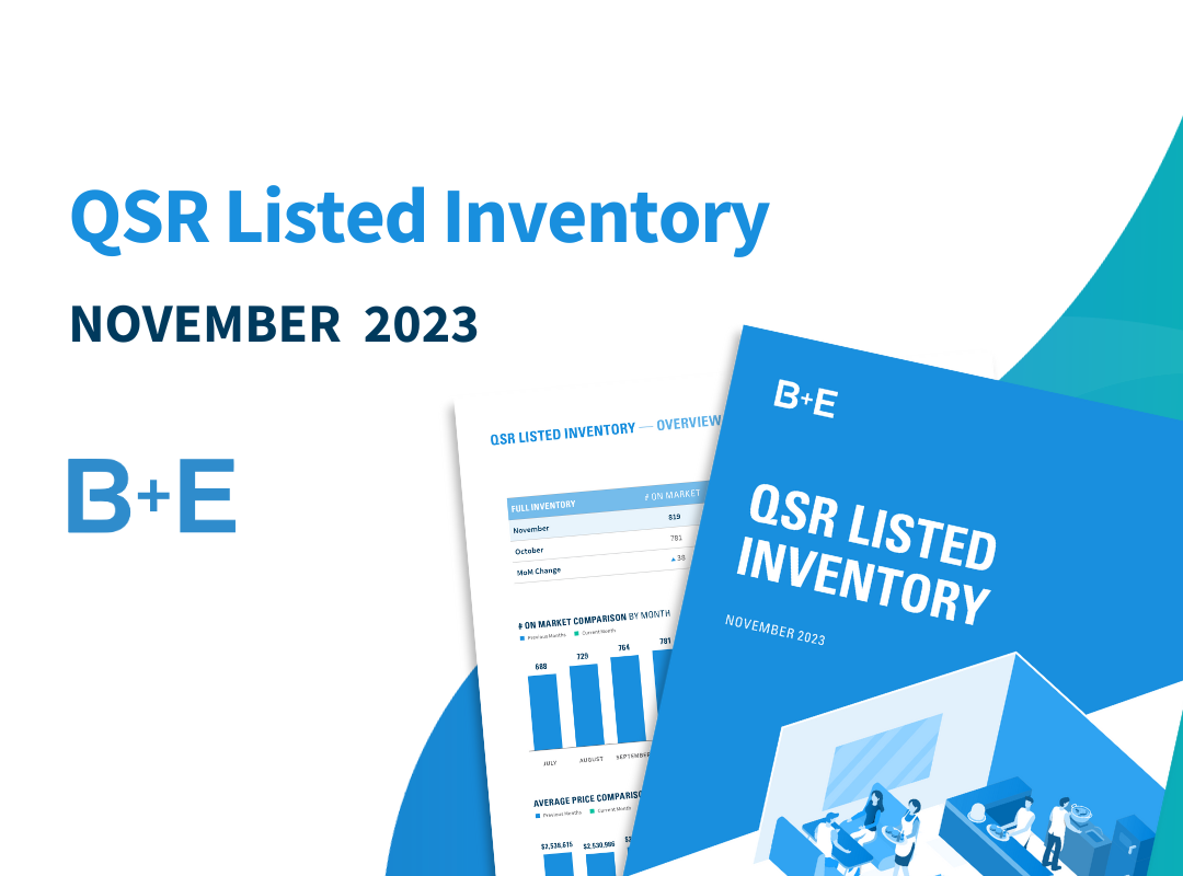 QSR Listed Inventory – November Download our QSR listed inventory report for:Listed inventory as of November 1, 2023Average on-market asking pricesAverage on-market cap ratesAverage lease terms & more! Download the Inventory Report: B+E Insights: